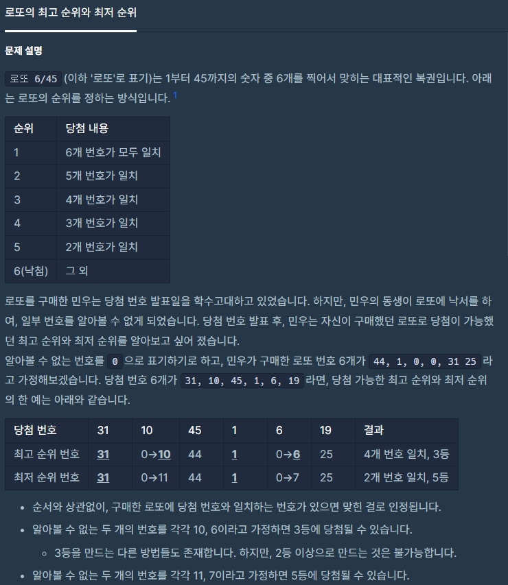 코딩테스트 연습 - 로또의 최고 순위와 최저 순위