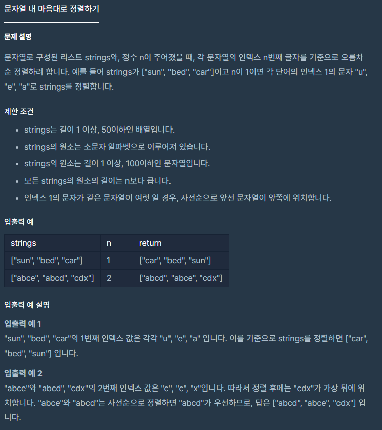 코딩테스트 연습 - 문자열 내 마음대로 정렬하기