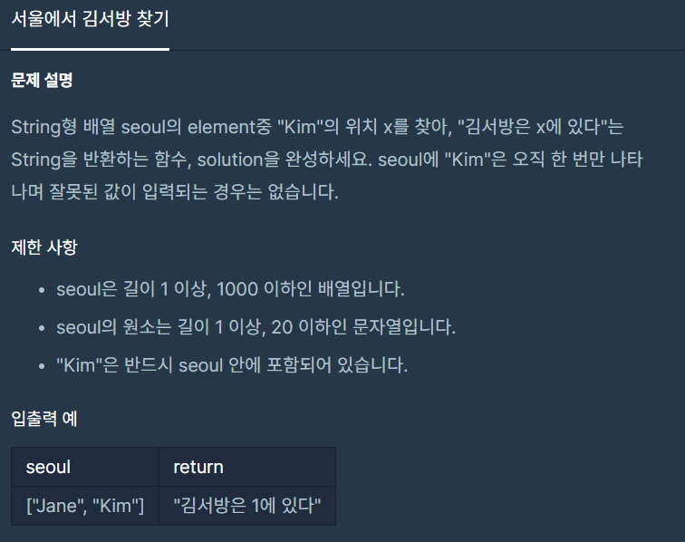 String형 배열 seoul의 element중 "Kim"의 위치 x를 찾아, "김서방은 x에 있다"는 String을 반환하는 함수, solution을 완성하세요. seoul에 "Kim"은 오직 한 번만 나타나며 잘못된 값이 입력되는 경우는 없습니