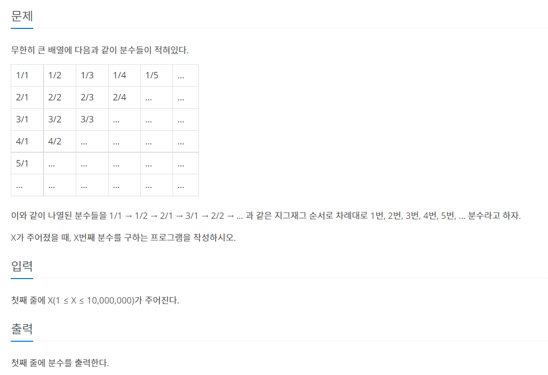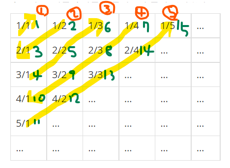 ex. 3라인에 있는 분수들은 각각 3/1(분자 + 분모 = 4), 2/2(분자 + 분모 = 4), 1/3(분자 + 분모 = 4)으로 모든 분자 + 분모의 값이 3(해당 라인)+1인 4가 된다.)