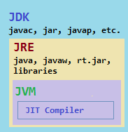 - JVM, Java 클래스 라이브러리, java명령 및 기타 인프라를 포함하여 컴파일 된 JAVA프로그램을 실행하는데 필요한 모든 것을 포함한 패키지