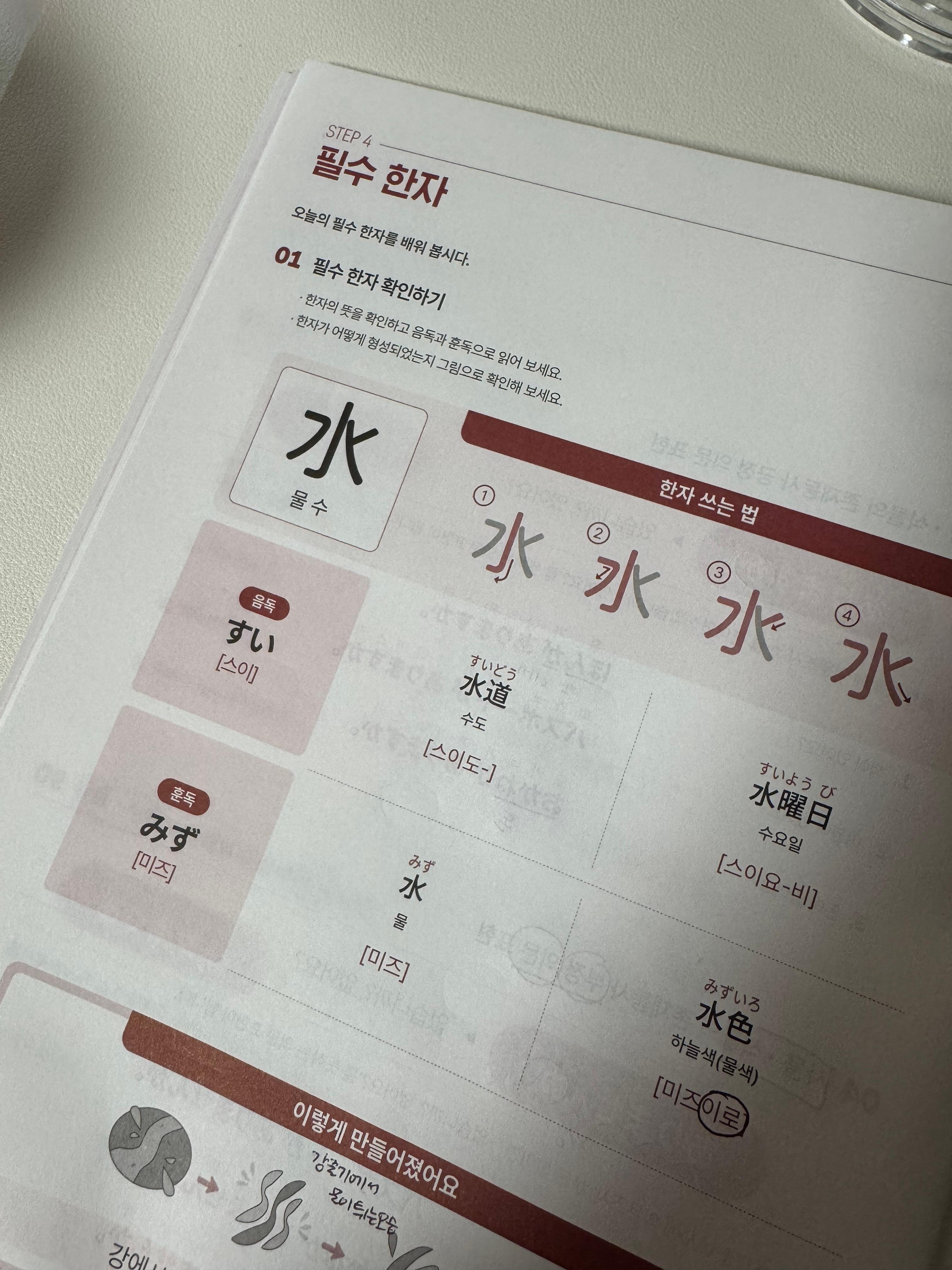 일본 여행갔을때 물 달라는 표현을 종종 쓸 때가 있어 그때 알아뒀던 水도 이번에 배웠다.