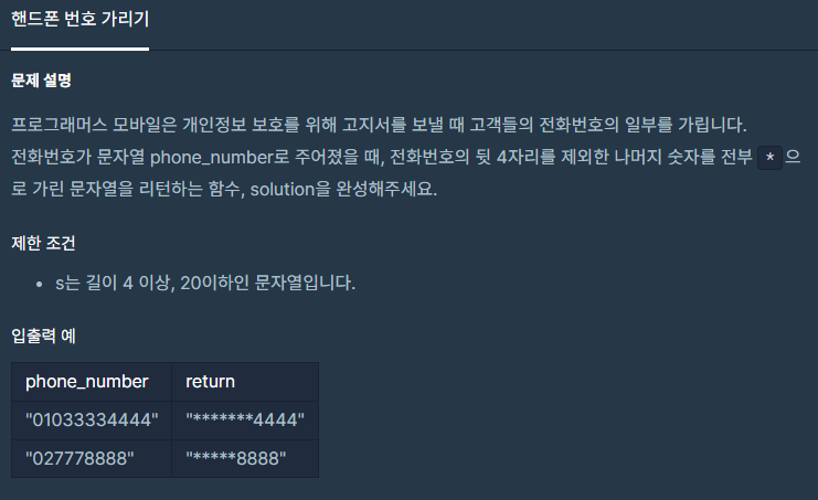 프로그래머스 모바일은 개인정보 보호를 위해 고지서를 보낼 때 고객들의 전화번호의 일부를 가립니다.